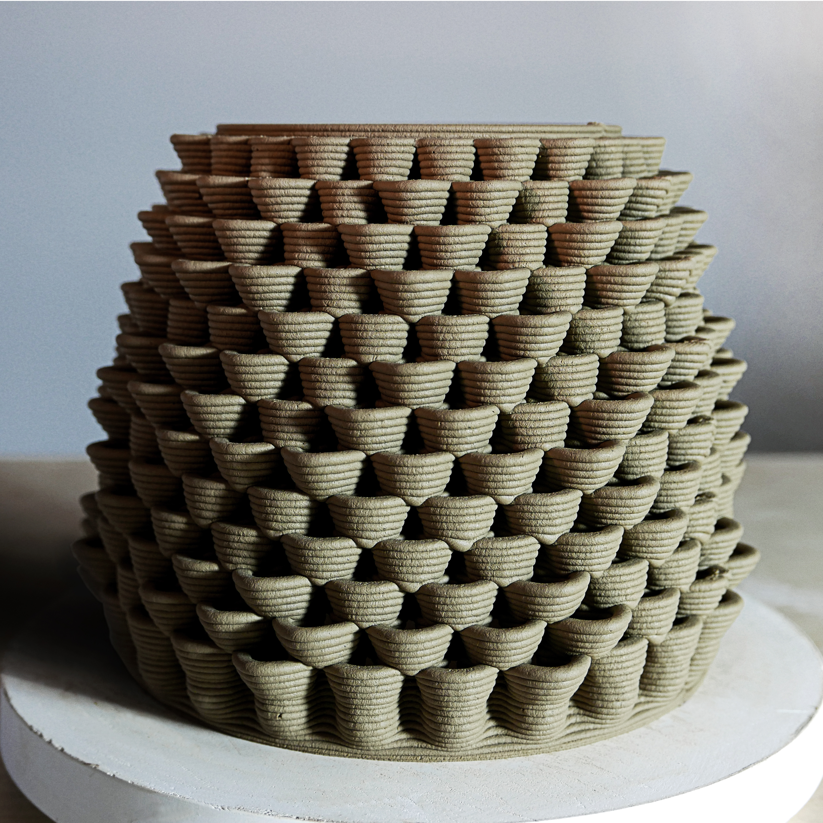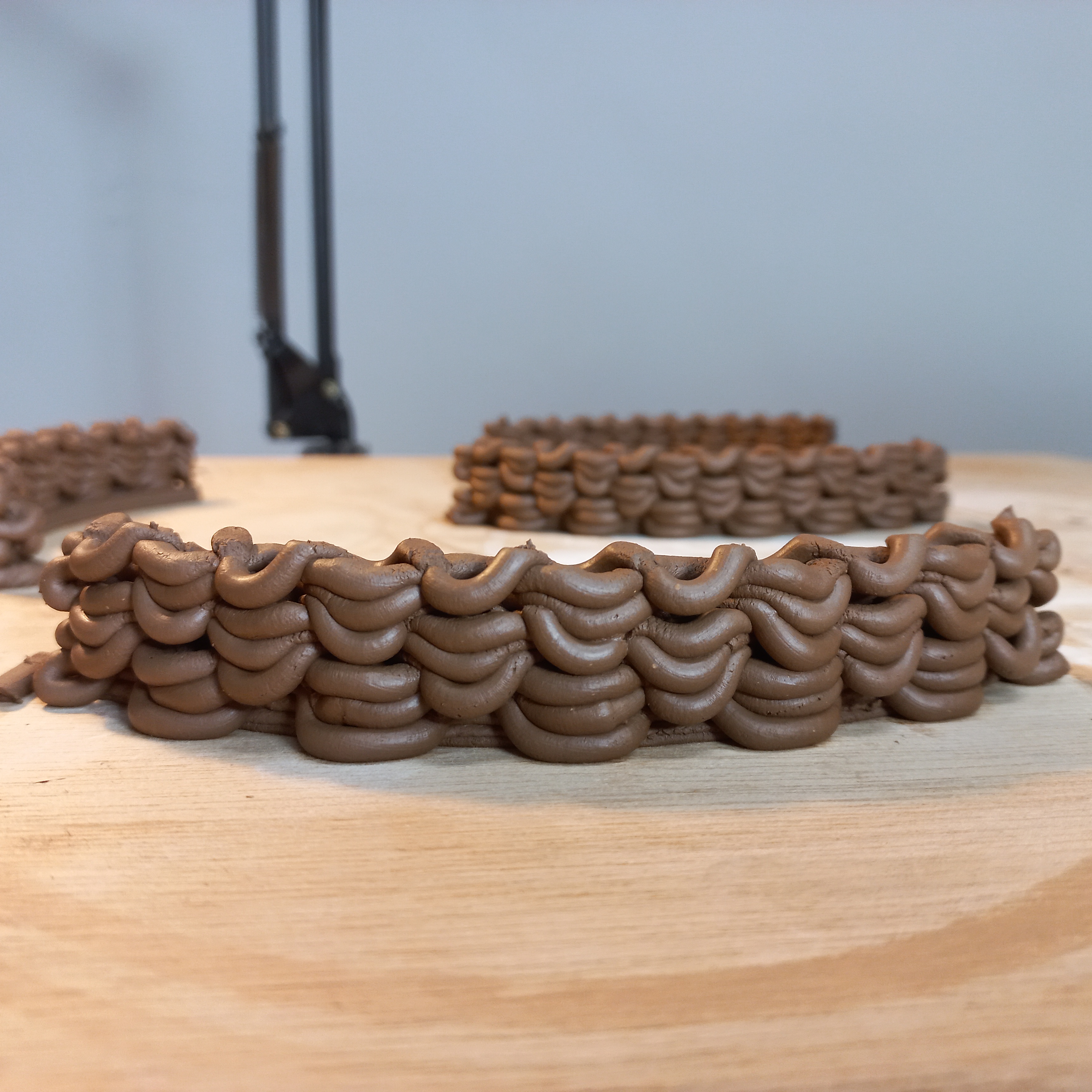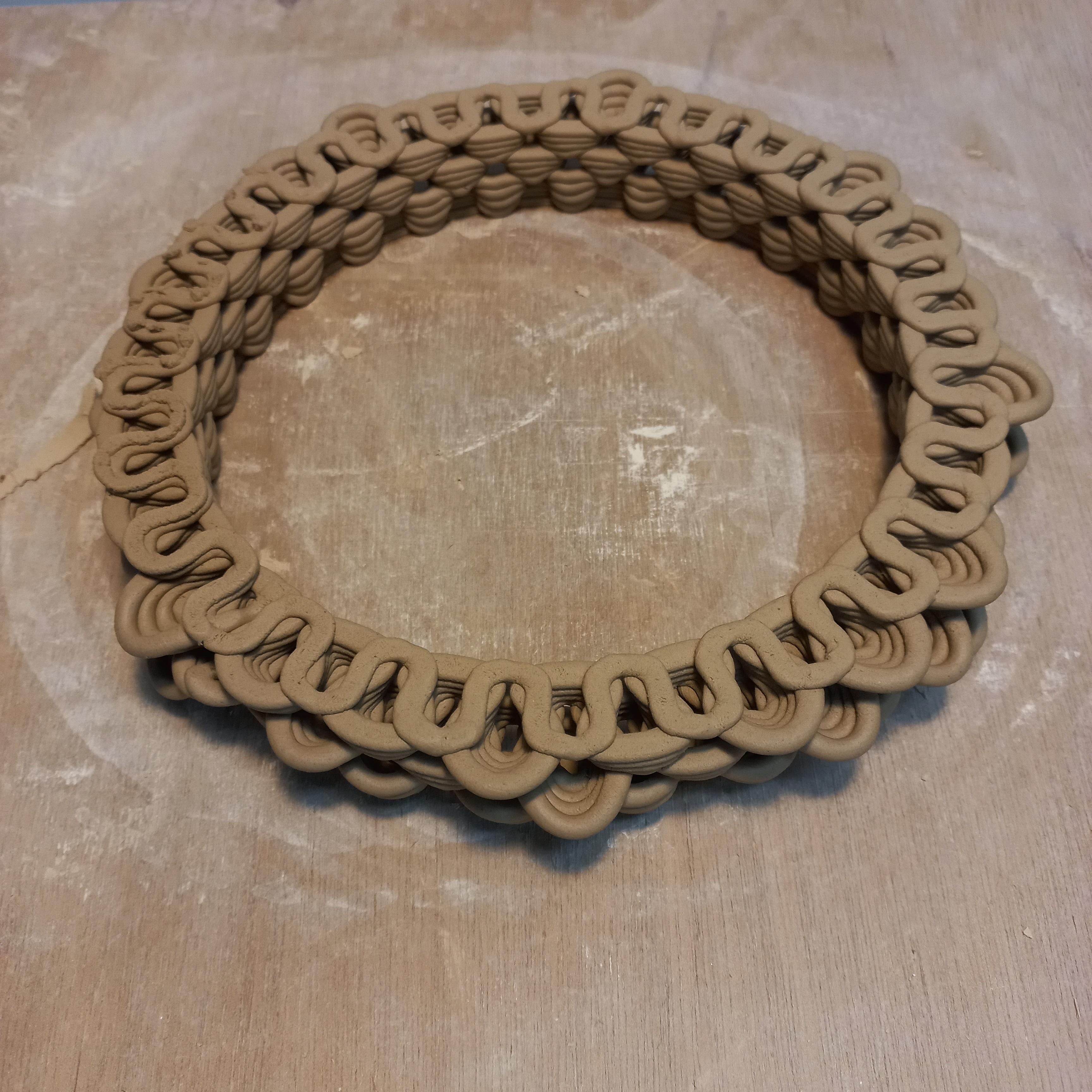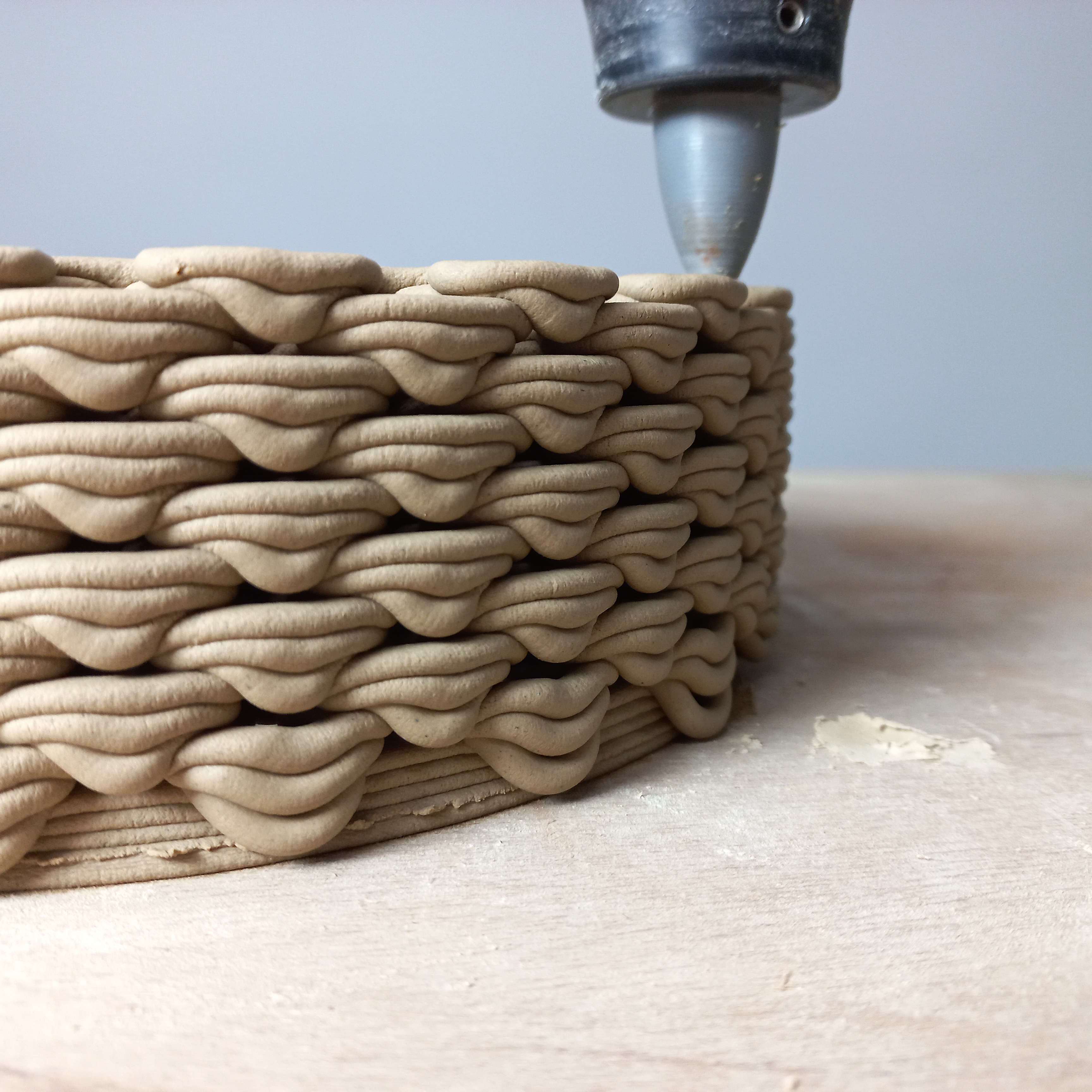 이 프린터를 이용해서 오프닝을 도자기 표면에 만든 아티스트들은 많이 있어서 방법을 찾는 것은 어렵지 않았다. 연속적인 프린팅에서 오프닝을 만들 수 있는 방법은 한정적이었다. 문제는 국내의 소지(점토)는 해외의 점토와 달리 좀더 내추럴에 가까운 상태이다. 도예에 대해 잘 모르지만 이번에 멘토님을 통해서 알게 된것은 국내산 소지는 청자토, 백자토, 산백토 등 색이나 도자기 종류에 따라 나눠진다. 하지만 이들의 자세한 성분을 알기 어렵고 매년 달라진다고 한다. 이유는 흙을 파는 광을 만들어도 1년이면 소진되고 그 후 다른곳을 파면 성분이 달라지기 때문이다. 하지만 유럽이나 미국에서는 점토에 들어있는 성분들의 비율이 데이터로 잘 나와있고 배합의 종류도 많다. 3d 프린팅에 적합한 점토의 비율에 대한 데이터는 인터넷에서 쉽게 찾을 수 있지만 그 성분들을 구해서 배합하기가 까다로웠다. 그래서 구하기 쉬운 국내산 점토를 쓰기로 했는데 프린트해보니 점토가 형태를 유지하는 힘, 점성이 해외의 점토보다 부족했다.