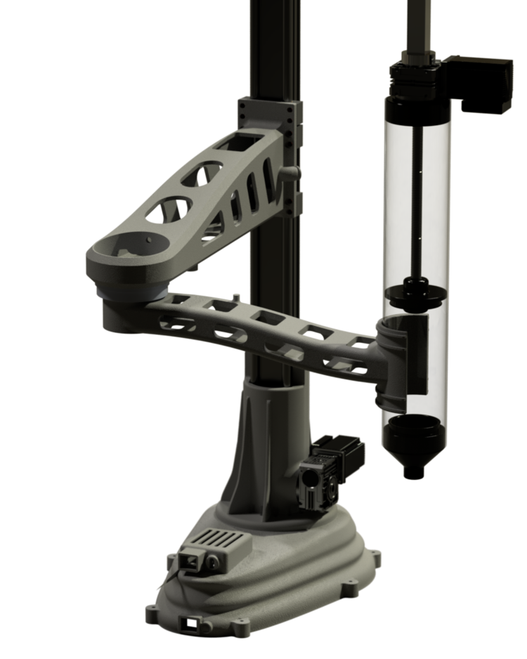 이 프린터는 로봇 팔처럼 생긴 구조가 점토가 들어간 실린더를 잡고 움직이는 형태이다.